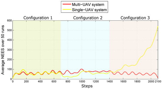 Figure 11 shows the average NEES over 50 Monte Carlo runs obtained for each system (multi-UAV and Single-UAV). The average NEES is calculated taking into account the eighteen variables that define the complete state of the UAVs and the lead agent (position and linear velocity). It is very interesting to note how the consistency of the filter considerably degenerates in the case of the single-robot system under its third configuration, this effect happens when the system is not fully observable. On the other hand, for the multi-UAV system case, the consistency of the filter remains practically stable. Given the previous results, the proposed Multi-UAV system presents a good performance in its three configurations, despite all the failures and disturbances introduced into the system. The above study provides a good insight into the robustness of the proposed system.