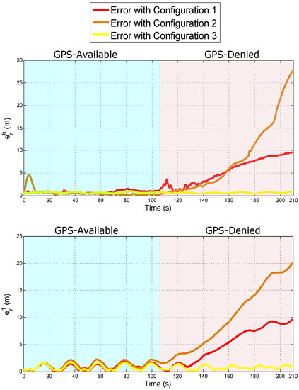 The following aspects are considered in this test: For configuration 1, altimeter measurements are also included, since, in practice, almost every UAV is equipped with this kind of sensor. For the configuration 3, during the first stage of the trajectory, GPS measurements are also included. These previous considerations will allow evaluating the performance of configuration 3 both in GPS-available environments and in GPS-denied environments.