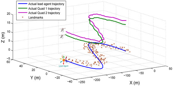 A set of simulations was also carried out, where the SLAM estimates are used as feedback to the control laws involved in commanding the formation of the UAVs with respect to the lead agent (see Section 6). This will allow observing the performance of both the estimation and control in a closed-loop manner.