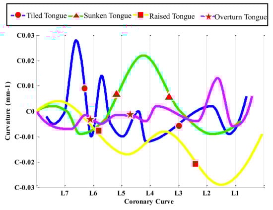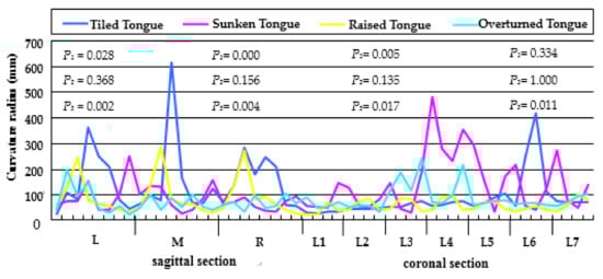 As for the coronal sections, the P3 values of Tiled Tongue, Sunken Tongue, Raised Tongue and Overturned Tongue are all less than 0.05, showing that the curvature of the seven coronal section curves all have a significant difference, indicating that curvature of the tongue changes greatly in some local areas, causing a significant difference between the seven coronal sections curves. Table 3 shows the curvature radius of the feature points in the coronal sections (L1-L7) in the four tongue states.