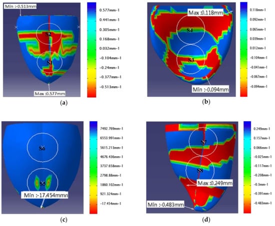 According to the position of the origin points, we selected two regional circles of interest having a diameter of 20 mm in each tongue surface, marking them as S1, S2, S3, S4, S5, S6, S7, S8, as shown in Figure 5. As can be seen in Figure 5, more curvature changes are shown within the regional circle of interest, which can represent to sense a large amount of food texture information. As shown in Figure 5a, S1 and S2 are centered at a distance of 25 mm between the horizontal planes. As shown in Figure 5b, S3 and S4 are tangent to each other. As shown in Figure 5c, S5 and S6 are centered at a distance of 27 mm between the horizontal planes. As shown in Figure 5d, S7 and S8 are tangent to each other.