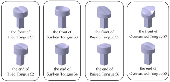 On the CATIA V5 R20 platform, the tongue in the circle of the abovementioned area of interest is obtained by using the groove tool of the part design module, and the morphological structure of the upper surface of the tongue is preserved. To be convenient to install, the protrusion tool was used to add a quadrilateral prism with the height of 20 mm and the length of side of 10 mm. After saving the 3D virtual model as a STL. format file, a 3D printer was used to print the bionic tongue indenter model. The filling rate was 80% and PLA material was used. This material has high mechanical strength, pressure resistance and heat resistance. It also has a certain resistance to bacteria, which is suitable for contacting food. Finally, eight bionic tongue indenter solid models were obtained, which were respectively named as the front of Tiled Tongue S1, the end of Tiled Tongue S2, the front of Sunken Tongue S3, the end of Sunken Tongue S4, the front of Raised Tongue S5, the end of Raised Tongue S6, the front of Overturned Tongue S7 and the end of Overturned Tongue S8, as shown in Figure 7.