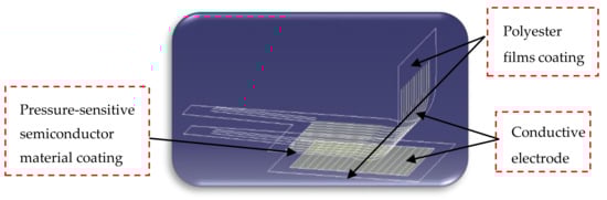 The arrayed film pressure sensor used in this work is a resistive pressure sensor, which has an “interlayer” structure, composed of two layers of films, a conductive electrode and a pressure-sensitive semiconductor material coating. The inner surfaces of both polyester films have transverse strip conductors or longitudinal strip conductors. A pressure-sensitive semiconductor material is sandwiched between two films. When the arrayed sensor is pressed, the resistance of the pressure sensitive semiconductor changes with the proportion to the external force, and the intersection of the horizontal conductors and the longitudinal conductors forms an array of pressure sensing points (PSP), whose sensing matrix is 52 × 44. The line interval of the sensor is 1 mm and the minimum area of the resolution unit is 2 mm×2 mm. That is, the rank of the sensing area of this sensor is 17 × 12.8 cm2. The sensor is packaged by a PET film with a thickness of 100 μm. PET film is non-toxic, chemically-resistant, friction-resistant, low-wear and high-hardness, and has greatest toughness among thermoplastics, which is good for us to do food experiments. What’s more, for this arrayed film pressure sensor, the sealing thickness is about 0.2 mm, the measuring range is 0–50 kg and the precision is ≤±20%. The structural diagram of the arrayed film pressure sensor is shown in Figure 8.