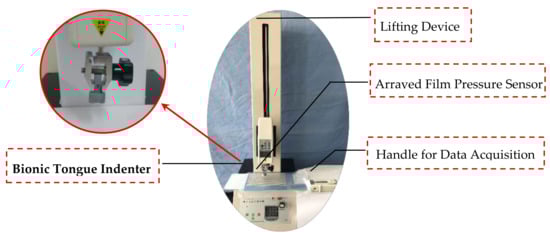Bionic tongue distributed mechanical testing device. It includes the bionic tongue indenter, the arrayed film pressure sensor, the handle for data acquisition and the lifting device.In order to collect the mechanical information perceived by the arrayed film pressure sensor, which needs to be completed by a data acquisition device, in this paper, we selected a handle for data acquisition produced by the I-Motion Company (Jiangsu, China) to realize the collection of sensing information. When the arrayed film pressure sensor is connected to the handle for data acquisition, the image of the dynamic pressure distribution in the whole sensing area in real time can be displayed and collected by the corresponding computer analysis software. Among them, the function of the handle for data acquisition includes operational amplifier, convertor (ADC) and USB data transmission function. Through the arrayed distribution structure of the ranks sized 52 × 44, the handle for data acquisition can perform multi-channel signal processing and data transmission of up to 2288 points. What’s more, the minimum sampling frequency is 10 ms and the image pressure range is 0–10 MPa.