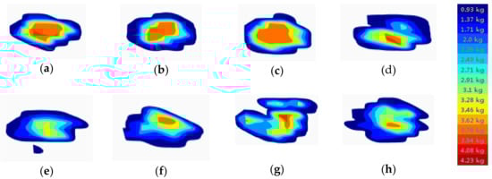 The images corresponding the maximum pressure of the JSL Cookie sample perceived by the eight bionic tongue indenters. The differences in color in the image indicate the difference in pressure data, and a gradual color change from blue to red represents the change in pressure from small to large: (a) S1; (b) S2; (c) S3; (d) S4; (e) S5; (f) S6; (g) S7; (h) S8.