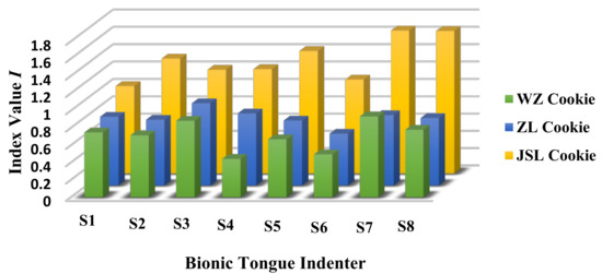 The indicator weight values obtained were brought into the model Equation (13). According to the food fineness perception evaluation model established based on the sensing mechanical information on the bionic tongue indenter surface, the fineness index values under the different bionic tongue indenters and the different kinds of cookie samples were calculated. Figure 11 shows the average of the fineness index values of the three kinds of cookies in steady status under the eight bionic tongue indenters.
