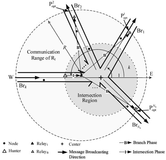 The objective of our relay-node selection is to deliver the message from to other branches as far and fast as possible. The proposal consists of two phases. The first phase is to find a node closest to C, aiming to cover the largest range in all branches with the selected relay node, referred to as Intersection Phase. In the second phase, referred to as Branch Phase, the farthest nodes in each branch except are selected as relay nodes.