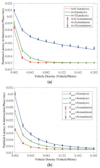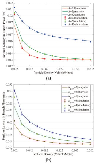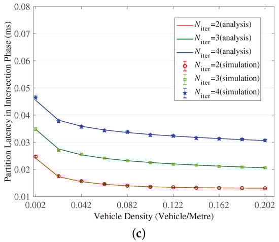In Intersection Phase, our proposal finds the nearer node to C than H in the circle region centered at C with radius of . In addition, H is from C. Therefore, the optimal position is C, and . Moreover, since the circle region covers branches, , where is the vehicle density in a branch. From (8) and (13), we can obtain the partition latency and the contention latency in Intersection Phase as