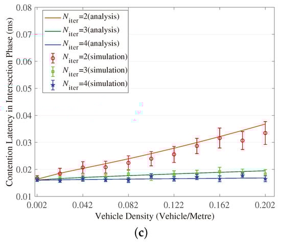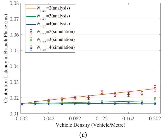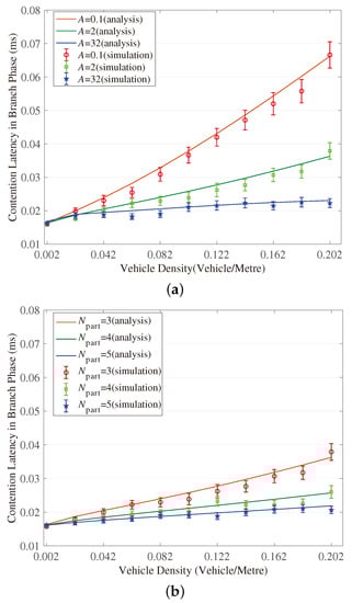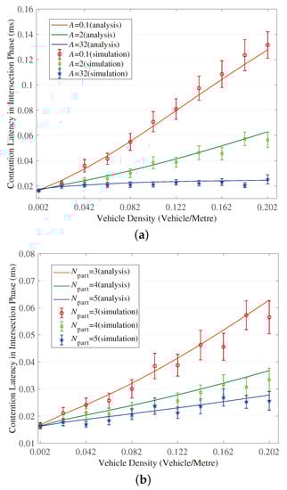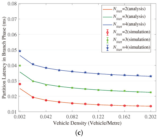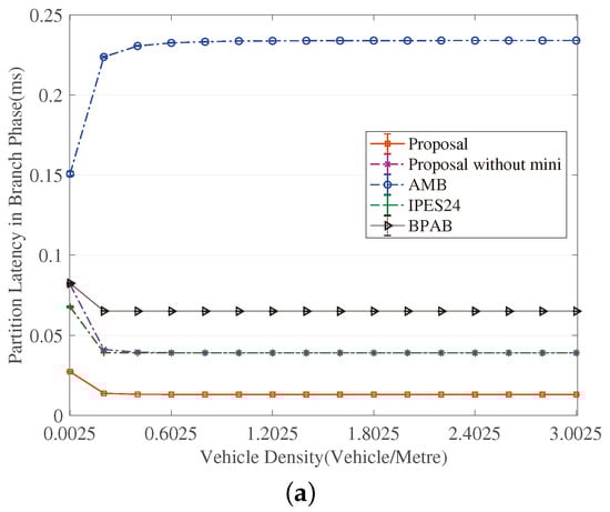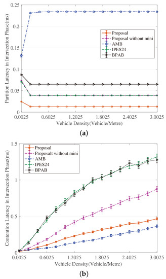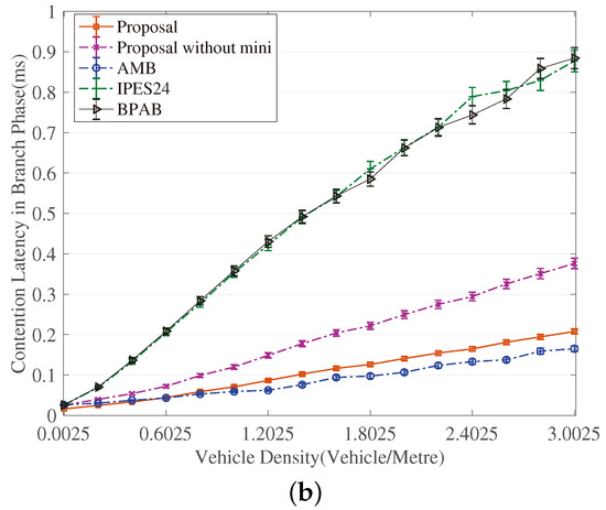 Figure 9 and Figure 10 reveal that the exponent partition mechanism is advantageous to the partition latency within a limited value (seen from the curves of ‘’Proposal without mini” in Figure 9a and Figure 10a), meanwhile is favorable of a significant gain in terms of the contention latency compared to BPAB and IPES24 (seen from Figure 9b and Figure 10b). Although at high vehicle densities (e.g., 3.0025 vehicles/meter), the gain in partition latency cannot make up the gap in contention latency compared to AMB, the mini-BBM mechanism benefits our proposal to defeat AMB in terms of the sum of partition latency and contention latency.