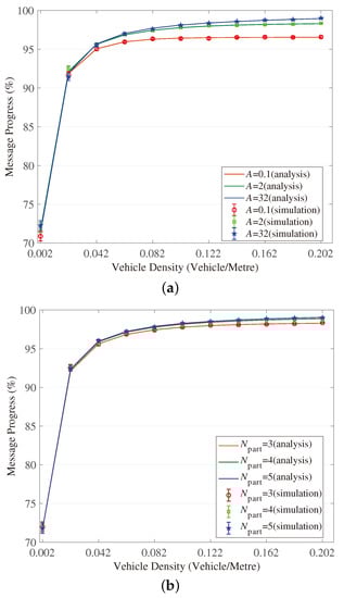 From these figures, some new interesting observations can be got as follows: (1) With one of the three parameters (, and A) decreasing, the partition latency is reduced. In addition, the gain of the partition latency benefited from the decreasing of the three parameters falls as the parameter becomes a smaller value. The similar tendency is also observed for the contention latency, message progress and PDR with the three parameters increasing. (2) The partition latency approaches a constant value when the traffic becomes heavier. This is because when the vehicle density rises over a particular value, at least one node exists in the final segment near the optimal position, then the number of B spent in the partition phase is fixed as . (3) We also find that the bigger values have the three parameters, the smaller the contention latency varies with density, shown as the lowest curve in Figure 4 and Figure 6. The observation is because the bigger values of the parameters can result in a thinner final segment. (4) Increasing these parameters can improve the contention latency but prolong the partition latency, and the influence is different at different vehicle densities. It is confirmed again that there are some optimal values for these three parameters to get a maximum message speed.