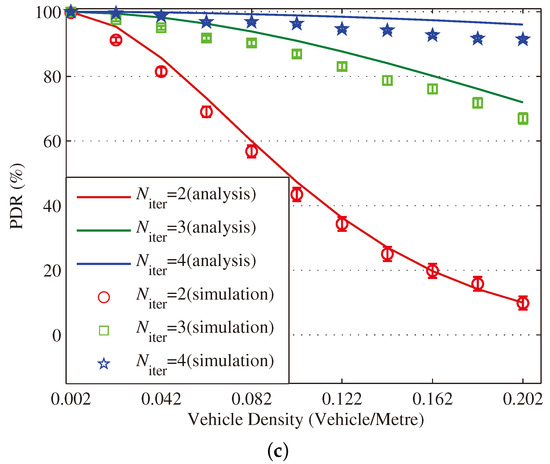 Validation of the analytical model for PDR. (a) When ; (b) When ; (c) When .