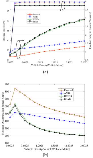 As a result, shown in Figure 11a, our proposal achieves more than 18.10%, 15.26% and 19.24% lower two-hop delay than that of BPAB, IPES24 and AMB. In particular in heavy traffic, the enhancement is more significant. Additionally, our proposal attains the second-best performance in terms of message progress, which is only 0.37% worse than the best performing AMB. Consequently, it can be observed in Figure 11b that the message dissemination speed achieved by our proposal outperforms that of BPAB, IPES24 and AMB by at least 21.89%, 17.87% and 23.35%. The improvement even goes up to 125.23%, 123.87% compared to BPAB and IPES24 at the high vehicle density of 3.0025 vehicles/meter, and 63.78% compared to AMB at the relatively low vehicle density of 0.2025 vehicles/meter. It is also observed from Figure 11b that, at the heavy vehicle density, the performance of BPAB and IPES24 in terms of message dissemination speed drops gently, not as drastically as expected. The reason is that when the re-attempt number of CTB contention is over the pre-selected number , the performance of this case in terms of message dissemination speed does not need to be evaluated, and the contention latency in average one-hop delay is decided by the duration of contentions in heavy traffic.
