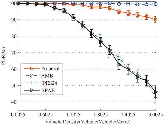Figure 12 demonstrates that our proposal presents the second-best performance in terms of PDR, which is over 90% stably. Although our proposal performs worse than the best performing AMB, it can be promoted by choosing a bigger A in dense networks. It is also observed that the performance of BPAB and IPES24 in terms of PDR degrades sharply as the vehicle density increases.