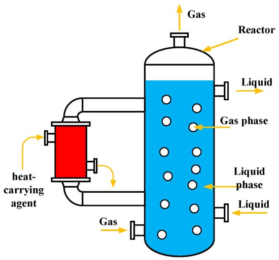 A typical bubble column reactor is shown in Figure 1. The liquid flows in from a pipe attached to the lower right of the reactor and flows out of the reactor from a pipe attached to the upper right part of the vessel. Gas flows in from the pipe attached to the lower left side of the reactor and flows out of the pipe attached at the top of the vessel. The separate component of reactor attached to the left side of the reactor is used to inject heat through a carrying agent, which can adjust the temperature of the reaction. A gas-liquid two-phase flow (bubbly flow) is then formed in the reactor. Once the reaction is underway, it is important to monitor the distribution of the bubbles in the reactor, which can have a significant influence on the reaction process and its effects.