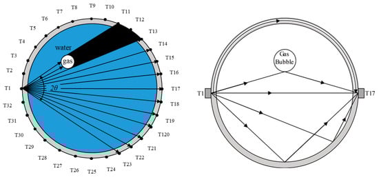 A 32-transducer UT sensor is selected as an example. An array of 32 ultrasonic transducers (T1 to T32) is evenly placed around the bubble column reactor. The pitch-catch method (transmission mode) and pulse-echo method (reflection mode) are the modes typically used in the UT system for gas-liquid flow imaging, and in this paper, a pitch-catch method (transmission mode) is considered. The signals received at the transducers from a transmitted wave are analyzed to determine whether there are any objects on the path between the transmitter and the receiver. The TOF (time of flight) and the amplitude of the direct wave can be used for image reconstruction. The basic working principle of the measurement method is shown in Figure 2.