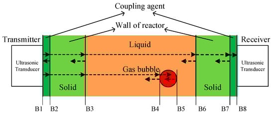 The actual propagation of ultrasonic waves between transmitter and receiver is, however, a complex process. For a typical bubble column reactor as shown in Figure 3, there are up to seven boundaries (B1 to B7) during the propagation of an ultrasonic wave. The ultrasonic wave is first excited by the transmitter. B1 is the first boundary, between the transmitter and the coupling agent, that connects the transmitter to the reactor wall. B2 is the boundary between the coupling agent and outer wall of the reactor, B3 is the boundary between the reactor inner wall and the liquid in the reaction area, B4 is the boundary between the liquid and the gas bubble, B5 between the gas bubble and the liquid on the opposing side of the bubble, B6 is between the liquid and the inner wall of the reactor on the opposite side of the reactor, B7 is between the outer wall of the reactor and coupling agent on that side, and finally, B8 is between the coupling agent and the receiver. In this process of propagation, the ultrasonic wave undergoes many phases of reflections and refractions. The propagated energy of the wave experiences attenuation and absorption, which has a direct impact on the measured results. In Figure 3, the colors of different areas refer to the different degrees of energy loss during propagation of the ultrasonic waves in those materials. For the coupling agent and the solid wall of the reactor, for example, most of the energy can penetrate with only limited energy loss. For the other interfaces, the energy loss depends on the difference of the acoustic impedance on either side of the interface.
