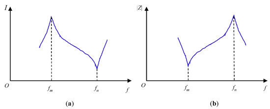 The relationship between internal current and input signal frequency of piezoelectric vibrator and its impedance curve. (a) The relationship between internal current and input signal frequency; (b) Impedance curve of piezoelectric vibrator.