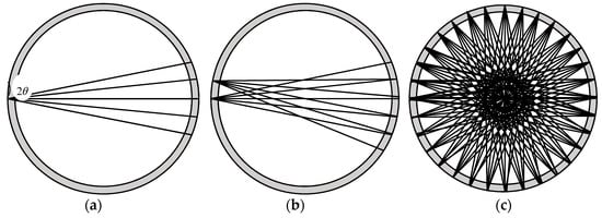 The ultrasonic wave emitted from a transducer propagates along a straight line within a certain angular sector range. The selection of the diffusion angle of the ultrasonic transducer depends on the specific detection purpose and its requirements. For image reconstruction with a 32-transducer UTT system, the wider the diffusion angle of a transducer, the more measurement values are available, which means better imaging quality. For example, a UT sensor may consist of 32 ultrasonic transducers with 22.5° diffusion angles. In this case, a signal is excited from a transmitter and the measurement signals are detected by four opposing receivers. Then, 32 transducers are set as exciters in turn, thus 128 measurements can be obtained. The ‘coverage’ of the sensing area is as shown in Figure 5. If 32 ultrasonic transducers are designed with 67.5° diffusion angles, and a signal is excited from a transmitter, then the measurement signals are detected by 12 opposing receivers. If 32 transducers of this configuration are set as exciters in turn, then 384 measurements can be obtained and the coverage of the sensing area is as shown in Figure 6. It is clear that the second UTT system arrangement has better ‘coverage’ of the sensing area than the first one. In other words, the wider the diffusion angle of the ultrasonic transducers, the more measurement data are obtained, which leads to better quality imaging results. The diffusion angle of the ultrasonic transducers is, therefore, an important factor for image reconstruction.
