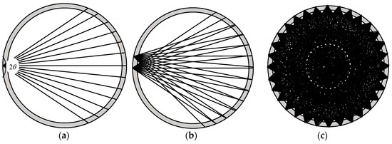 The schematic diagram of the superposition of acoustic waves emitted by sensors when the 2θ is 22.5 degrees (a) The sound beam width of a single sensor; (b) The superposition of the acoustic beam of two adjacent sensors; (c) The superposition of the sound beam of 32 sensors.