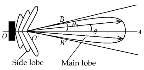 where, λ is a wave length of ultrasonic wave in the testing medium. The diffusion angle 2θ−3dB denotes to the sum of the angles on both sides of transducer’s central axis (axis OA), and θ−3dB is corresponding to the angel of the connection line between the point at −3 dB of the maximum response of signal (i.e., O’B and O’B’), and transducer’s central axis.