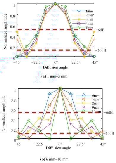 Note that k is an empirical constant. k is 0.54 when −6 dB is considered, and k equals 1.08 when −20 dB is discussed. If a circular piezoelectrical transducer with a 10-mm diameter is taken as an example, the 2θ−6dB and 2θ−20dB diffusion angles of the transducer in water are 30.9° and 64.2°, respectively, when the excitation frequency is 300 kHz.