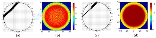 Considering the covering ratio of the cross section, we next take the sector diffusion sensitivity matrix from T1 to T9 as an example (Figure 9c). This is produced by connecting those boundary points that are T1 and two midpoints between T8, T9, and T10. Compared to the final straight-line sensitivity matrix in Figure 9b, the full fan-shaped sensitivity matrix has better uniformity and continuity in Figure 9d, especially at the central area of the cross section.