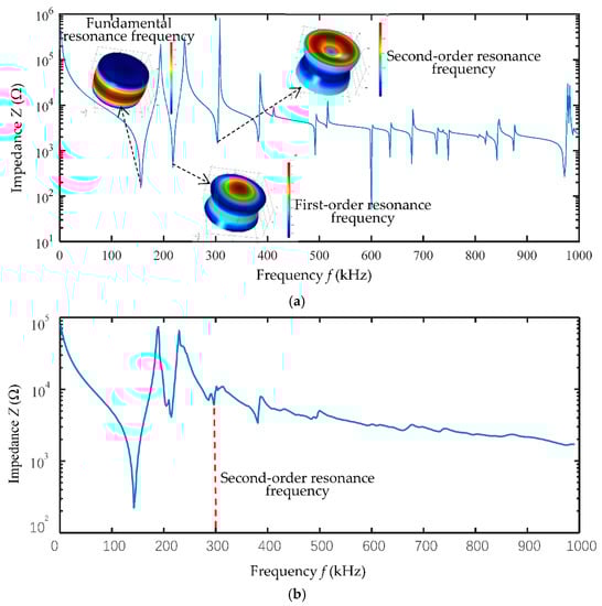 To generate a longitudinal vibration mode at a resonance frequency of 300 kHz, the diameter of the transducer is set to 10 mm and the thickness of the transducer is set to 6.7 mm. The impedance curve and the surface stress at the resonance frequency point of the piezoelectric cylinder are shown in Figure 10a, and the fundamental, the first-order and second-order resonance frequencies are presented in the figure. A longitudinal vibration mode are generated at the second-order resonance frequency point which is 300 kHz. A batch of transducers were then produced and the impedance curve evaluated to verify the result, as shown in Figure 10b.