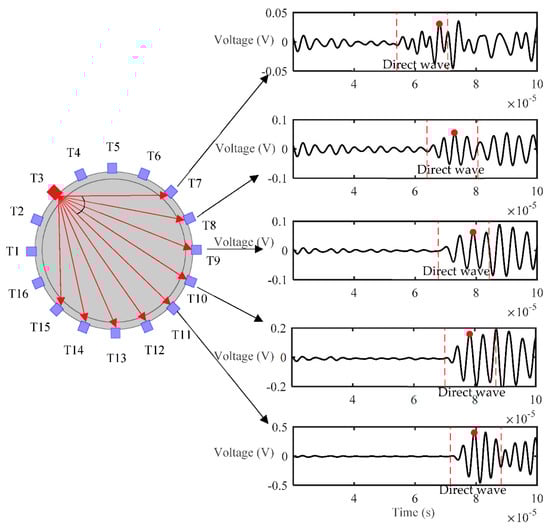 For the experiments, the excitation signal was a 5-cycle Hanning window modulated sine wave with a frequency of 300 kHz. A 3-volt excitation voltage was produced by the function generator, and then amplified by 50 times so that the voltage of the excitation at the transducer was 150 V. The signal sampling rate was 10 MHz, the number of sampling point was 1000, and the sampling duration was 100 μs. The signals obtained under full reactor conditions were determined to be the reference signal set. All of the transducers could be set as transmitters or as receivers, and each transducer was excited in turn. Figure 12 presents the arrangement of the transducers (T1 to T16) and received signals (within the 0–100 μs time period) at the opposing transducers (T7 to T15, which were within the diffusion angle range), when T3 was set as the transmitter. Note that only signals received by T7 to T11 are presented in Figure 12 because of the symmetrical structure. As shown in Figure 12, the amplitude of the direct waves received from T7 to T11 increased in steps because of the effects of the diffusion angle variation. The TOF (time of flight) of the direct wave from T3 to T7 through T11 gradually increased. As discussed in Section 2.1.3, the diffusion angles 2θ−6dB and 2θ−20dB of the transducer in water should, in theory, be 30.9° and 64.2°, respectively, however, the actual diffusion angles 2θ−6dB and 2θ−20dB of the designed transducers were 17.8° and 45°, respectively. The reason for this difference is that the diffusion angle of the transducer is affected by the thickness of the reactor’s wall. Note that only the signals received by T9 through T13 could be used to reconstruct images with the diffusion angle 2θ−20dB of 45°. The normalized amplitude of the transducers is shown in Figure 13, which also indicates how many effective values were received by the transducers that could be used to reconstruct images.