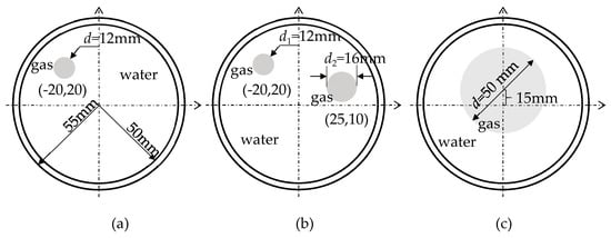 Three different flow patterns, namely, single gas bubble, double gas bubbles with different diameters, and eccentric flow, were considered in following experiments. The geometric parameters of the bubbles and the reactor are shown in Figure 14.