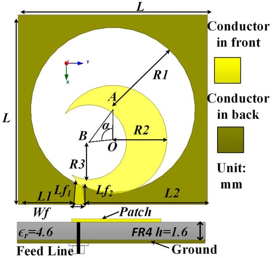 The geometric layout of the realized sickle-shaped antenna is displayed in Figure 1, which is designed and fabricated on the low-cost epoxy resin (FR4) substrate with the relative permittivity of 4.5 and a dielectric loss of 0.02. The physical dimensions of the anticipated antenna are 39 mm × 39 mm × 1.6 mm, which is 0.29λ × 0.29λ × 0.012λ for the lowest −10 dB frequency. The anticipated antenna is comprised of a semicircular slotted patch with a tapered microstrip feed line on the upper side of the substrate and a circular slotted square ground plane on the other side of the substrate. This semicircular patch radiator is fed by a 50 Ω tapered microstrip line to create a sickle-shaped with a width of Wf1 and a length of Lf1 for signal transmission. A circle with center O and radius R1 is imprinted out from the rectangular ground plane, which is responsible for the created wideband impedance bandwidth with linear polarization (LP) in the desired operating band. On the other hand, the semicircle patch is created by subtracting the circle (B, R3) from the circle (O, R2), where A and B define the center of the two circles and R is the radius of the circle. These three points (O, A, B) make an angle <AOB, which is defined by α. By tuning the angle α = 96°, the maximum impedance and AR bandwidth are acquired. The semicircular slotted patch and feed line make the shape appear as a sickle. The comprehensive dimensions of the optimum antenna configuration as exposed in Figure 1a are L = 39 mm, Lf1 = 4.15 mm, Lf2 = 5.14 mm, Wf = 2.24 mm, R1 = 17 mm, R2 = 11.2 mm, R3 = 7.7 mm, h = 1.6 mm, α = 96°, and L1 = 25.42 mm.