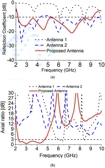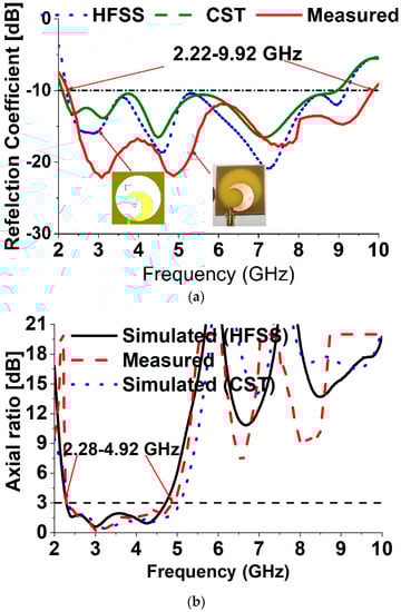 Effects of antenna evaluation: (a) reflection coefficient (S11), (b) AR.