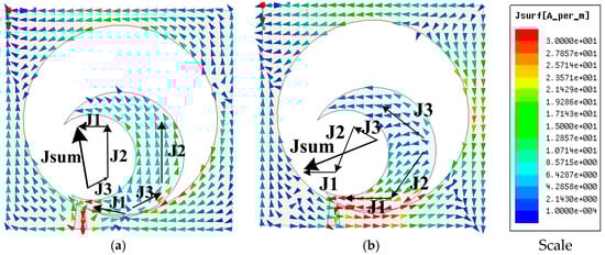 To justify the CP property mechanism, the computer-generated surface electric current distribution of the anticipated semicircular radiating patch at 2.6 GHz in the Z > 0 direction is displayed in Figure 4, where Jsum characterizes the vector sum of all the significant current distributions. Jsum at t = 0 is orthogonal compared to that in t = T/4 and alternates clockwise as the period increases in the regular interval, thus generating the left-hand circular polarized (LHCP) radiation in the +Z direction.