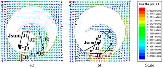 The simulated surface current distributions at 2.60 GHz (a) t = 0 (b) t = T/4 (c) t = T/2 (d) t = 3T/4.