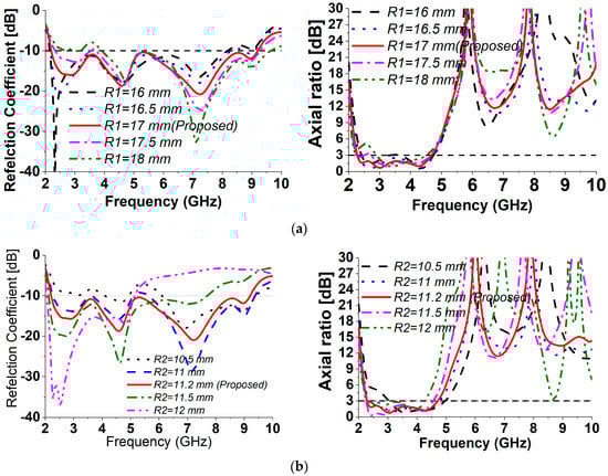 The proposed antenna functionality is also examined when the patch circle radius R2 is diversified as depicted in Figure 5b. The impedance bandwidth is relatively susceptible to the deviation of R2. From Figure 5b, it can be noticed that reducing R2 with esteem to the ideal 11.2 mm causes the antenna to reduce its −10 dB bandwidth while raising it causes the antenna S11 to reduce in the upper rate of the recurrence range. However, the variants of R2 have a nominal influence on the CP radiation in the larger frequency range. Nevertheless, when R2 is reduced with regard to the most effective worth, the antenna seems to lose its CP procedure in the low operating frequency range.