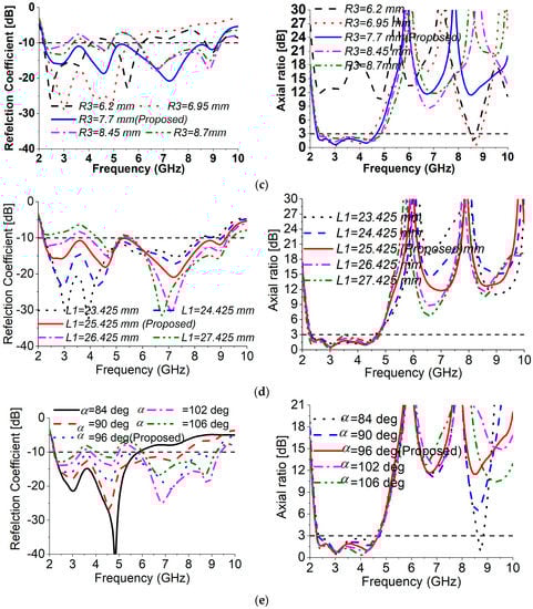 Figure 5e depicts the antenna performance versus the <AOB angle α. From this figure, the S11 is sensitive to the variation of the three-circle angle α. The S11 at the lower frequency bands tends to decrease as α increase, while very small changes are found at the higher frequencies. However, when the angle decreases from the optimum value, the lower frequency does not affect while the higher frequency S11 decreases. However, variations of α have a minor aftereffect of the AR based on the desired operating band.