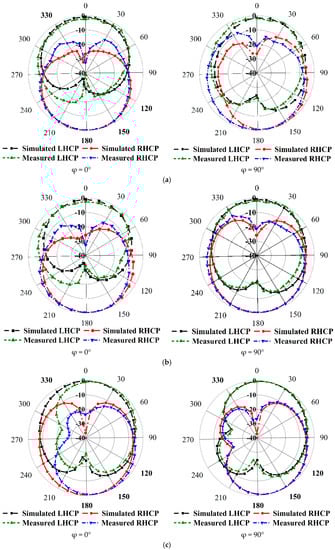 The numerical and measured CP radiation patterns at (a) 2.4 GHz (LHCP and RHCP) (b) 3.5 GHz (LHCP and RHCP) and (c) 4.3 GHz (LHCP and RHCP).