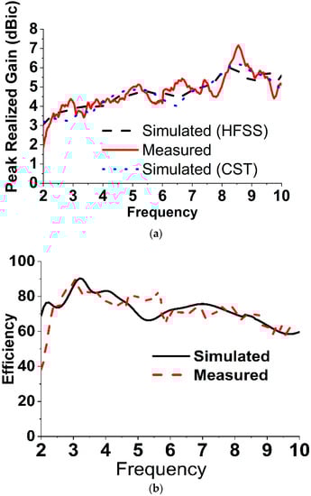 To validate the feasibility of the proclaimed broadband CP antenna, a constructed prototype was measured and fabricated. The experimental results are measured with an Agilent N5227A PNA microwave network analyzer (Keysight, CA, USA) and a UKM Satimo StarLab (Microwave Vision Group, French). The snapshots of the fabricated antenna are verified in Figure 6a. From the realized results portrayed in Figure 6a, the measured impedance bandwidth of the reflection coefficient below the −10 dB is approximately 7.70 GHz (2.22–9.92 GHz), which is approximately 126.85% with regard to the center frequency at 6.07 GHz. On the other hand, the measured 3 dB AR bandwidth is around 2.64 GHz (2.28–4.92 GHz), which is approximately 73.33% at 3.60 GHz in Figure 6b. The measured and simulated radiation patterns at 2.40 GHz, 3.50 GHz and 4.30 GHz are plotted in Figure 7. The antenna radiates a bidirectional wave with opposite sense circular polarization. The radiation pattern of the antenna is usually LHCP (Left Hand Circular Polarization) for Z > 0 and RHCP ((Right Hand Circular Polarization) for Z < 0. It can be seen that the primary beam direction hardly shifts away from the zenith at both frequencies. The measured and simulated broad sight gains and antenna efficiency are shown in Figure 8. The average measured peak realized gain is greater than 3.98 dBic in the realized CP operating band and the maximum peak realized gain is around 4.85 dBic at 4.92 GHz. The antenna efficiency of the archived 3 dB AR frequency band range is approximately 80%.