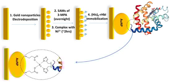 Schematic procedure of gold electrode modification steps for the (His)6-rHbI protein immobilization over AuNPs via polyhistidine-tag with 3-MPA/Ni2+ complex.