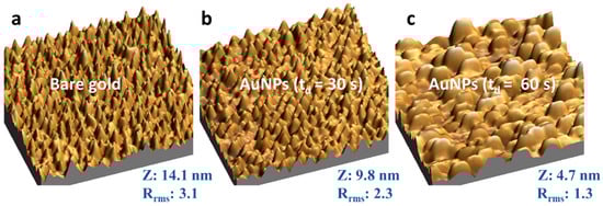 Figure 2 shows the AFM images (1 μm × 1 μm) of AuNPs over the gold substrate. The time-dependent size of AuNPs is in the range of 20–150 nm of extent with gold nano-island formation instead of spherical nanoparticles. The z-height decrease as the electrodeposition time increases since the electrodeposited AuNPs fill the valleys of the bare electrode resulting in decreased height and smoother surfaces, as revealed by the root mean square roughness factor (Rrms).