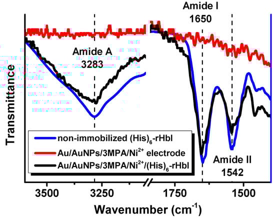 The ATR-FTIR technique was used to corroborate the presence of the protein, and the secondary structural conformation after immobilization. We compare the IR-spectra in the amide A, amide I and amide II regions of the non-immobilized protein with the immobilized (His)6-rHbI protein over gold. The amide A band is mainly due to N-H stretching vibration in resonance with amide II, while amide I absorptions result primarily from the C=O stretching vibration of the amide group, and amide II absorptions arise from N-H bending and C–N stretching vibrations [,,]. The amide I and amide II band locations are commonly used to analyze secondary structure changes since they are directly related to the backbone conformation and are hardly affected by the nature of the side chain []. The sensitivity of the amide I vibration to secondary structure makes it possible to study protein conformational changes upon adsorption on solid substrates. Figure 3 illustrates the IR spectra of the amide A, amide I and amide II regions for the (His)6-rHbI in direct contact with the diamond of the instrument (blue line), the IR of the electrode before the (His)6-rHbI immobilization (red line), and the immobilized protein over the modified gold electrode (black line). The IR-spectra of the non-immobilized protein concurs with the spectra of the immobilized protein in those regions, showing bands at 3283 cm−1 in the amide A region and 1650 cm−1 and 1542 cm−1 corresponding to amide I and amide II. There is a slight shift to higher wavenumbers of the amide I and amide II bands, of approximately 4 cm−1, relative to the values of the non-immobilized (His)6-rHbI protein probably due to Au-surface interaction.