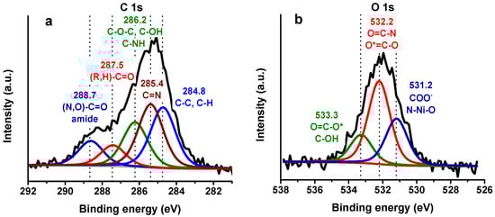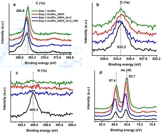 X-ray photoelectron spectroscopy has been applied recently to characterize and quantify the protein layer over AuNPs, allowing the detection of the protein and the determination of the surface coverage over the substrate [,,]. Moreover, XPS provides accurate information about the chemical environment and how it changes as the electrode is modified. Figure 4 compares XPS high-resolution spectra (HRS) at regions of carbon (C 1s), nitrogen (N 1s), oxygen (O 1s), and gold (Au 4f) in the consecutive steps of the modification process: (1) Bare gold electrode with electrodeposited AuNPs, (2) AuNPs with SAMs of 3-MPA, (3) AuNPs/3MPA complexed with Ni2+, and (4) AuNPs/3MPA/Ni2+ with immobilized (His)6-rHbI protein. Each modification step shows differences between XPS spectra suggesting changes in the chemical environment at the surface, especially after protein adsorption. In the C 1s region of the first modification step, presented in Figure 4a (green line), the carbon peak is attributed to adventitious carbon contamination (C–C, C–H at 284.8 eV) which is commonly found in all samples exposed to the atmosphere. The next two steps in Figure 4a correspond to SAMs of 3-MPA over AuNPs (red line) and to the AuNPs/3-MPA/Ni2+ (blue line) modifications. Compared to the previous step, there is displacement to higher binding energies (BE). This shift is evidence of a new chemical environment probably corresponding to the S–C (~286.5 eV) and O–C=O (~288.5 eV) present in the 3-MPA molecule, an indication of successful SAMs formation. Additionally, in the last step of the modification process when the protein is adsorbed (Figure 4a, black line), the spectrum shows a broader peak with a bump to higher BE indicating an increase in the concentration of new species of carbon, related to amine and amide groups coming from the immobilized protein. The XPS results in the last modification step will be further discussed in the peak fitting analysis, Section 3.3.