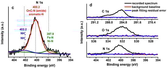 XPS-HRS and peak fitting of (a) C 1s, (b) O 1s where * refer to the O peak assigned and (c) N 1s in the last step of the modification (Au/AuNPs/3MPA/Ni2+/(His)6-rHbI) with possible peak assignment, (d) residual error after peak fitting for C 1s, O 1s, and N 1s.