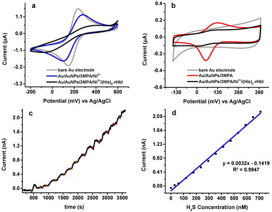 Electrochemical analysis: (a) CV in 1.0 mM K3Fe(CN)6/0.1 M KCl at 20 mV/s; (b) CV in phosphate buffer, pH = 7 at 20 mV/s; (c) direct current potential amperometry under an operating potential of 230 mV in phosphate buffer pH = 6.5 with Au/AuNPs/3MPA/Ni2+/rHbI electrode; (d) corresponding calibration curve of amperometric response toward H2S.
