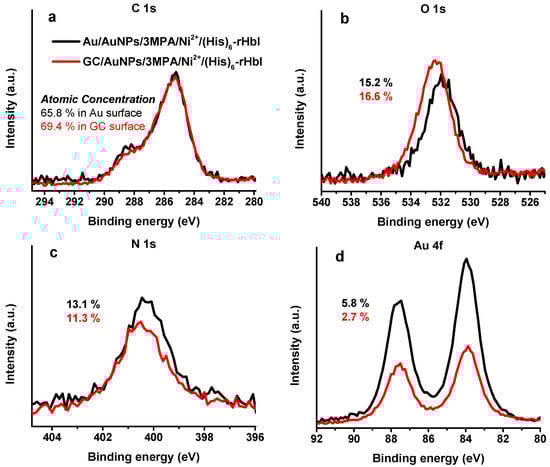 The Au and GC surfaces were modified following the same stepwise modification described in Figure 1, i.e., AuNPs/3MPA/Ni2+/(His)6-rHbI. Both samples were analyzed by XPS with an Mg Kα X-ray source. Figure 7 shows the HRS obtained for the C 1s, O 1s, N 1s, and Au 4f regions. In the C 1s region (Figure 7a), both spectra are very similar showing a bump to higher BE indicative of new chemical species of carbon, such as amide/peptide bonds, relative to the previous modification step (not shown). For the O 1s region shown in Figure 7b, the GC modification is shifted to higher BE relative to the AuNPs-protein modification. This behavior could be attributed to differences in the surface. Both samples show a prominent nitrogen peak, display in Figure 7c, evidence of the immobilized protein over the modified surface with higher protein concentration in the Au surface. Figure 7d, the Au 4f region, shows the successful electrodeposition of AuNPs over GC surface, and higher intensity for the Au surface, as expected. In the GC sample, the intensity of Au 4f peak was higher after protein immobilization compared to the previous modification step probably due to enlargement of AuNPs. This phenomenon has been observed before and used for the detection of flavonoids [,]. The similarity of XPS results of Au and GC surfaces validates that GC, which is more affordable than Au, can also be used as a platform for protein immobilization over AuNPs.