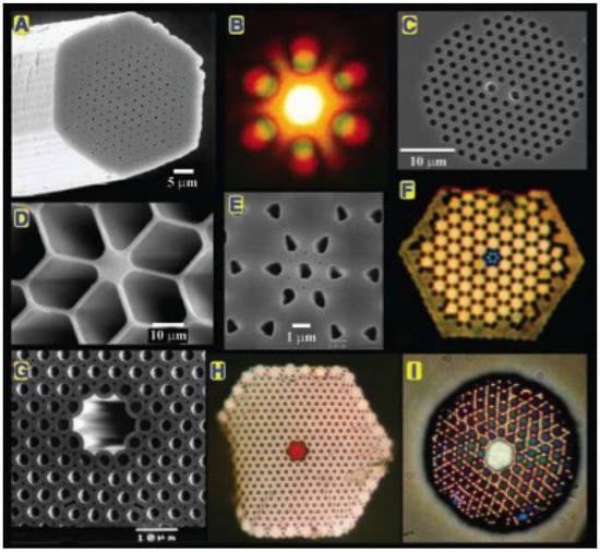 The first performing PCF was manufactured in November 1995. It featured a hexagonal close-packed array of small air channels and was free of major imperfections or defects []. Although it turned out that the PCF was a guiding light via the index-guiding (IG) mechanism, from the structural point of view, it was the first fiber-photonic equivalent of a pure dopant- and defect-free semiconductor crystal. Most importantly, it demonstrated that the periodicity of the microcapillaries can be intentionally disrupted by introducing defects, which in the following years led to the design and fabrication of a very broad range of different PCF, as shown in Figure 1.