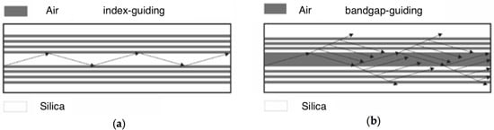 When a PCF has a hollow core or, generelly, a lower refractive index in the core than in the cladding, the light is guided by the photonic bandgap effect. The cladding is built by a periodic microstructure that forms a two-dimensional photonic crystal in the transverse plane, whose dielectric properties are characterized by photonic bandgaps. The periodic structure inside the PCF is locally broken, by creating the lower-index core usually by omitting one or more glass capillaries during fabrication. By proper geometrical design, it is possible to achieve light guidance in the hollow core of the PCF at those wavelengths for which transverse leakage through the cladding is forbidden by corresponding bandgaps (Figure 2b). As a result, light can be guided in a mostly empty core with an effective modal index close to unity. Indeed, photonic crystals with two- or three-dimensional periodicity can be seen as generalizations of Bragg mirrors []. The simple approach that employs reflection and transmission matrices cannot be applied analytically. The aim of using periodicity in two dimensions, in the PCF cladding, is to achieve an omnidirectional bandgap. Bandgaps can exist for all directions of propagation in the plane of periodicity, and propagation of light in any transverse direction can be forbidden. When a bandgap exists regardless of the propagation direction and polarization, the photonic bandgap is complete. Inserting a defect in the middle of the structure permits the existence of a propagating mode in the perturbed crystal. If the propagation constant of this mode coincides with a bandgap in the transverse plane, then the mode will be confined in the locality of the defect, namely the PCF core.