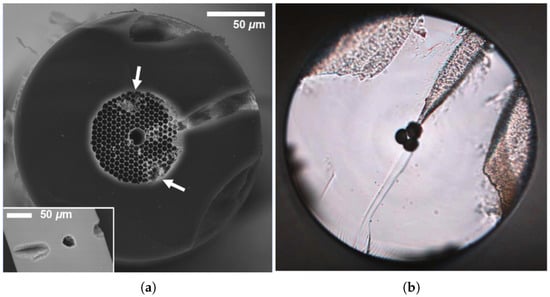 (a) SEM image of a micro-channel fabricated in a hollow-core photonic bandgao fiber: arrows indicate damage caused by laser “scoring” (inset shows channel and “scoring” lines on uncoated fiber surface, prior to cleaving); (b) optical microscope image showing the cross section of a microchannel fabricated in a SCF, reprinted with permission from [].