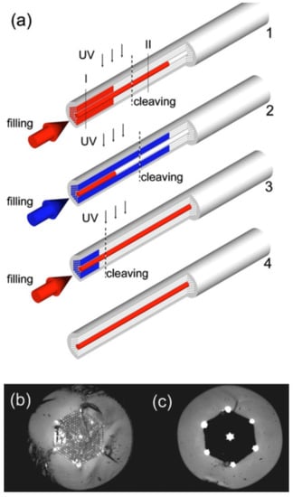 (a) Schematic flowchart on selective filling of photonic crystal fibers. The images (b,c) are optical microscope images of the fiber cross sections at the cleave positions I and II. The light regions correspond to the holes filled with polymer, reprinted with permission from [].