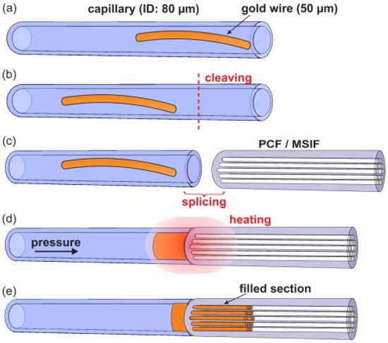 The spliced-fiber pressure-filling technique. (a) a gold wire is inserted into a silica capillary; (b) the wire is pushed into the capillary using a tungsten wire and the capillary end cleaved off; (c) capillary with wire is spliced to a silica fiber with hollow channels; (d) the spliced section is heated to the melting point of gold and high pressure argon gas is applied; (e) the filled structure. Reprinted with permission from [].