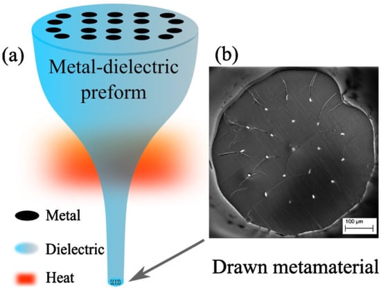 (a) schematic of a metal-dielectric preform, drawn into a metamaterial via heating; (b) SEM micrograph of a fabricated 590 µm indium-filled PMMA fiber cross-section, reprinted with permission from [].